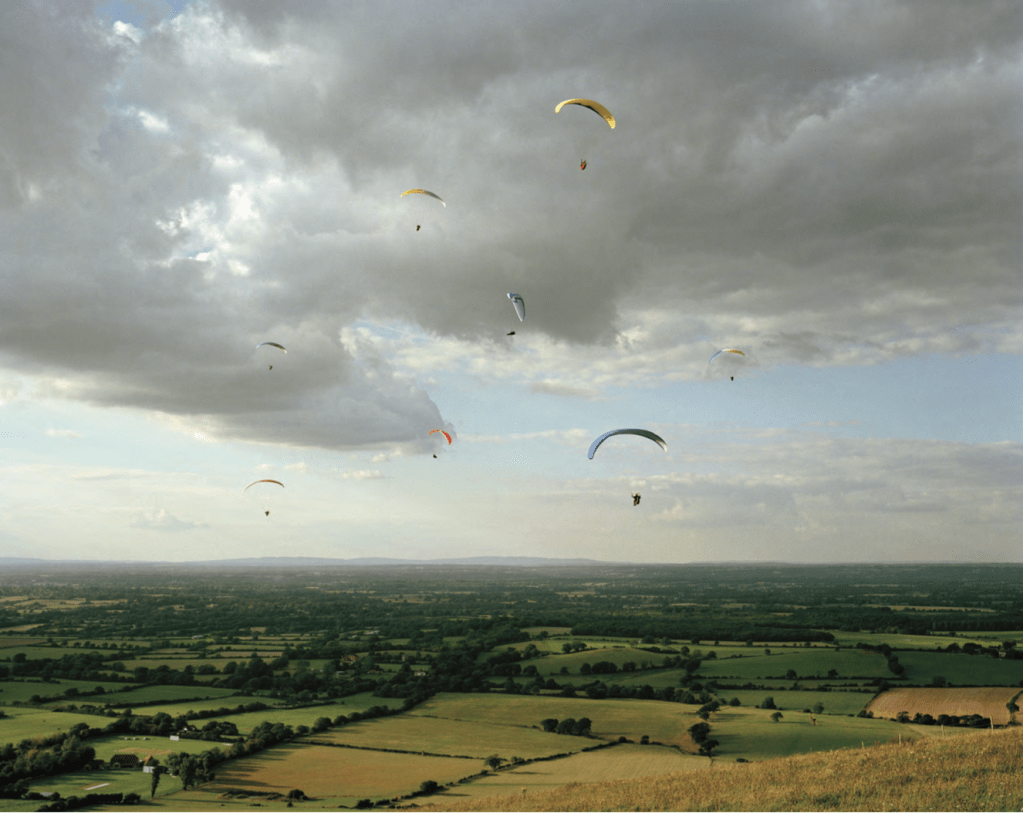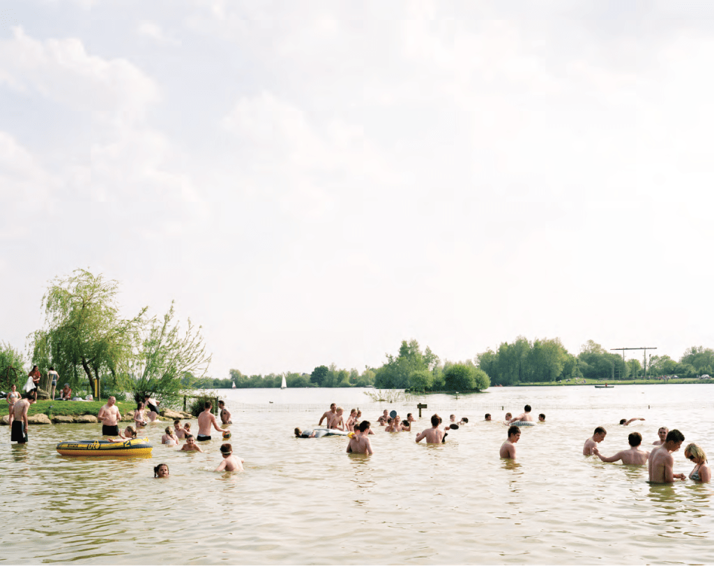 In a number of the photographs, scenes of modern-day leisure take place on what were once industrial sites. For instance, the flooding of gravel excavation pits a few years ago create the Cotswold Water Park, which now boasts the largest inland beach in England. Much of the gravel, which had been extracted for over 60 years, was used for building projects in the region.