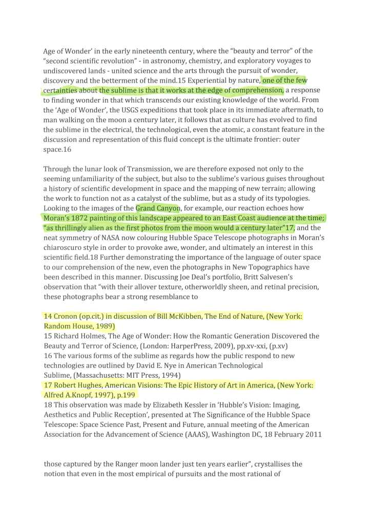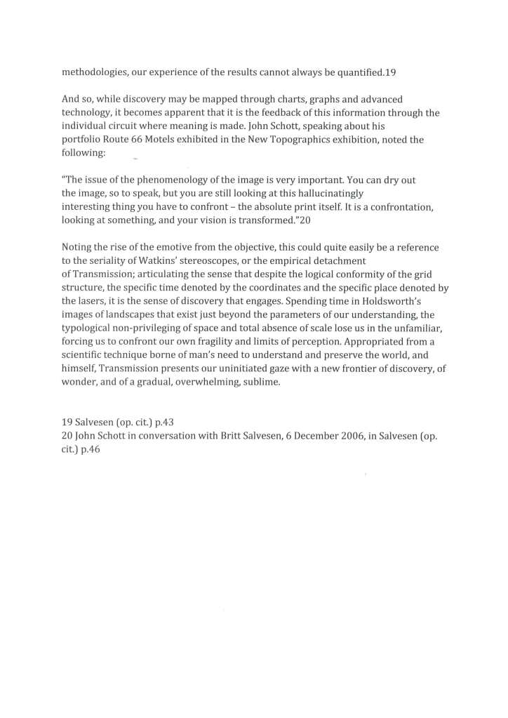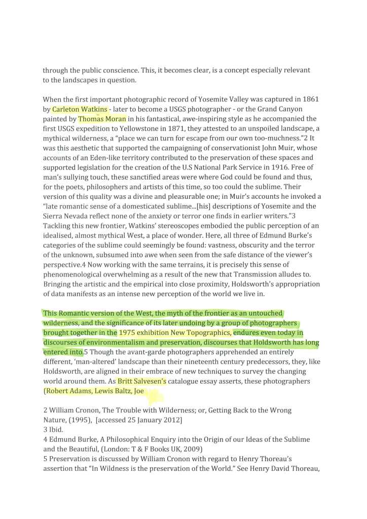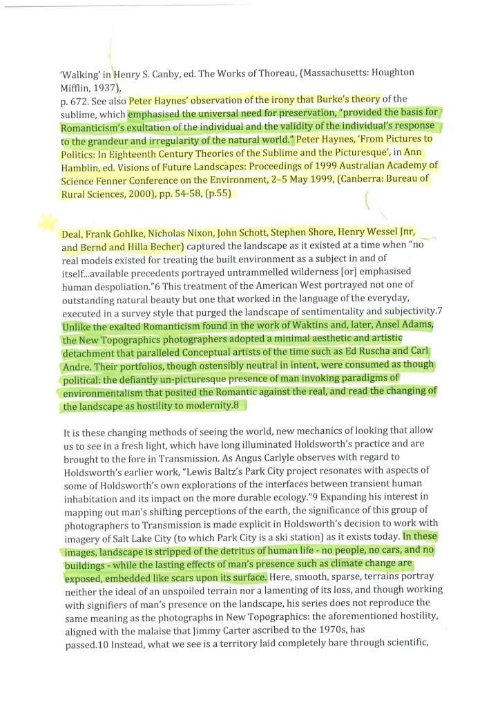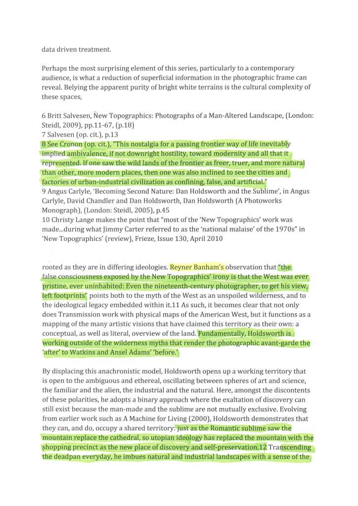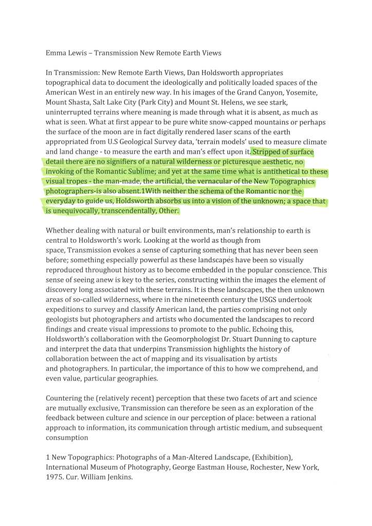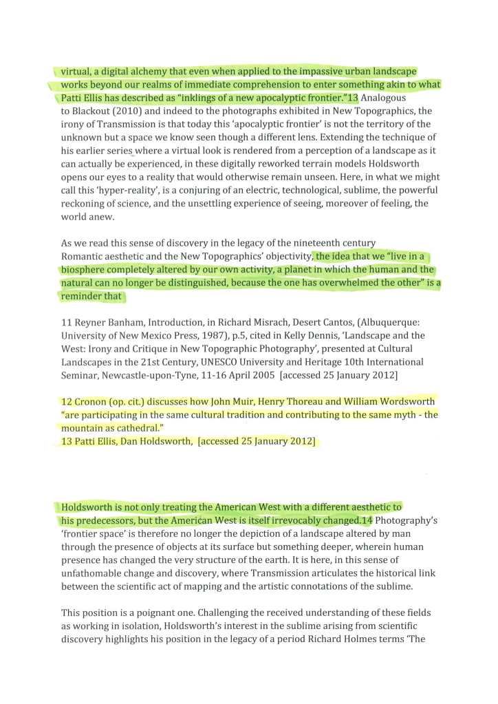 In my studies of the work of Dan Holdsworth I have found the essay section of his website to hold a wealth of leads towards development of ideas. Through the main project pages for Holdsworth I will display his works and accompany them with contextual considerations. Here below is an example of an essay about Holdsworths’ series ‘Transmission’ written by Emma Lewis. The pages shown are where I have printed the original essay, highlighted and annotated it and then scanned it. The pages shown here show that highlighting. The green areas are elements which are note-worthy and would possibly be used and cited further down the line. The areas highlighted in yellow are names and/or projects for further investigation. It is worth noting that in my role as a Photography teacher, some of the green highlighted areas may be in reference to how they could influence my practice in the classroom and to assist my students in their own work.