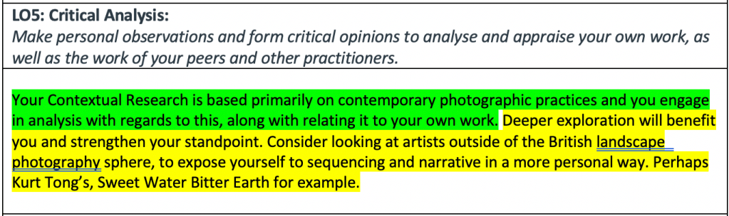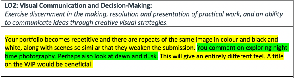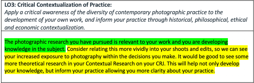 Similar to the comments from LO1, LO2 alludes to a weakened submission as a result of a narrower body of work. The comment highlighted in green here will form a greater contribution to Module 3 in the way of the photography I produce. As with LO1, LO2 is exclusive to the WIPP.