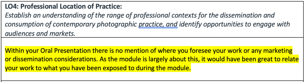 There is good reference here to some of my abilities but that this did not always translate. As LO1 only comes from the WIPP in Module 2 this comment can only refer to that. A greater variety of photography would have really helped and this is something I will reflect on at greater length going forwards.