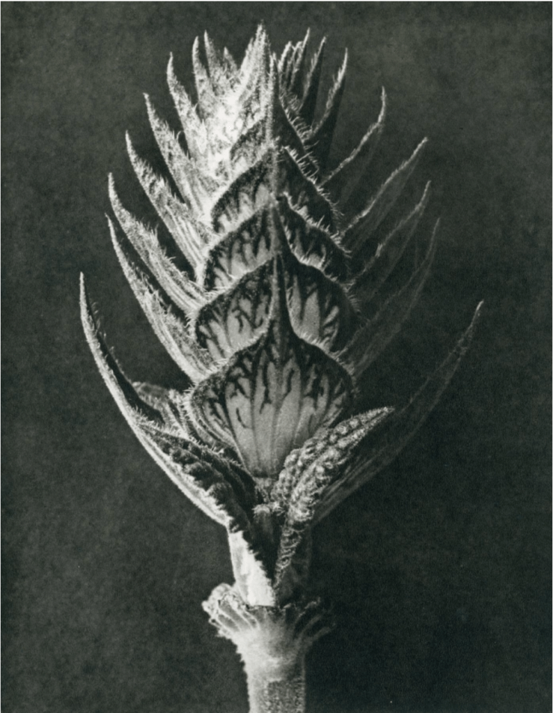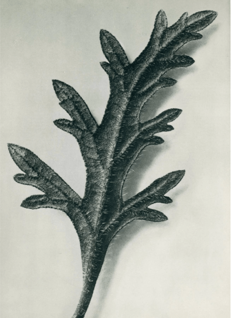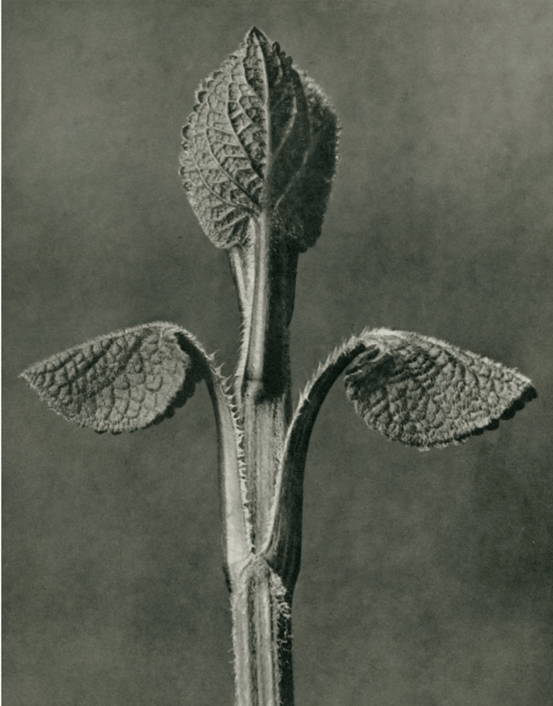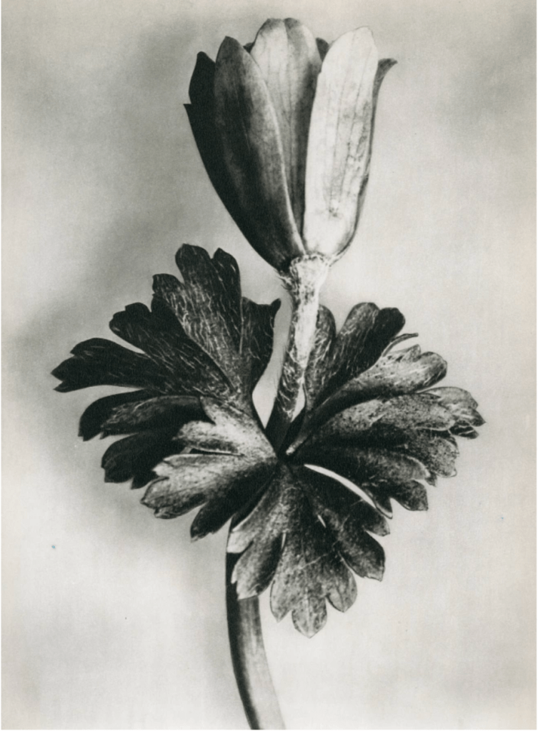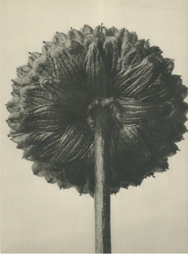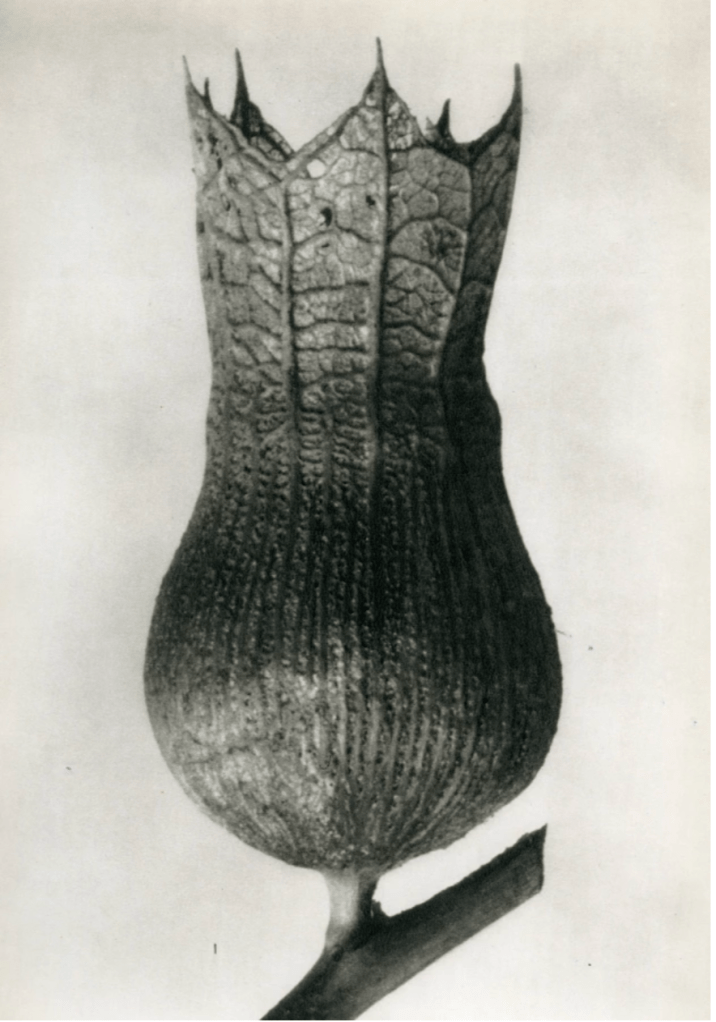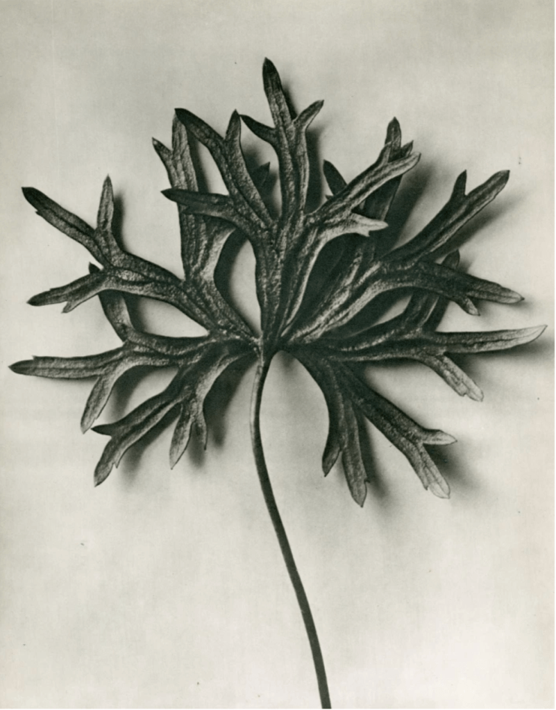 Working in the early 20th Century, Blossfeldt sought inspiration for his plant forms from the works of Fox-Talbot and Anna Atkins and their floral contact prints made in Calotype and Cyanotype forms respectively in the 1800’s. A lecturer of architecture, Blossfeldts original purpose for his photography macro studies of plants was to draw inspiration to use in the design of buildings. The resulting images have gone on to become admired as photographic works in their own right.