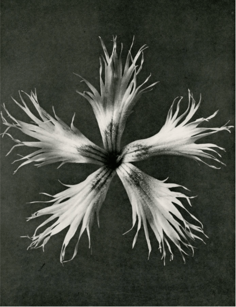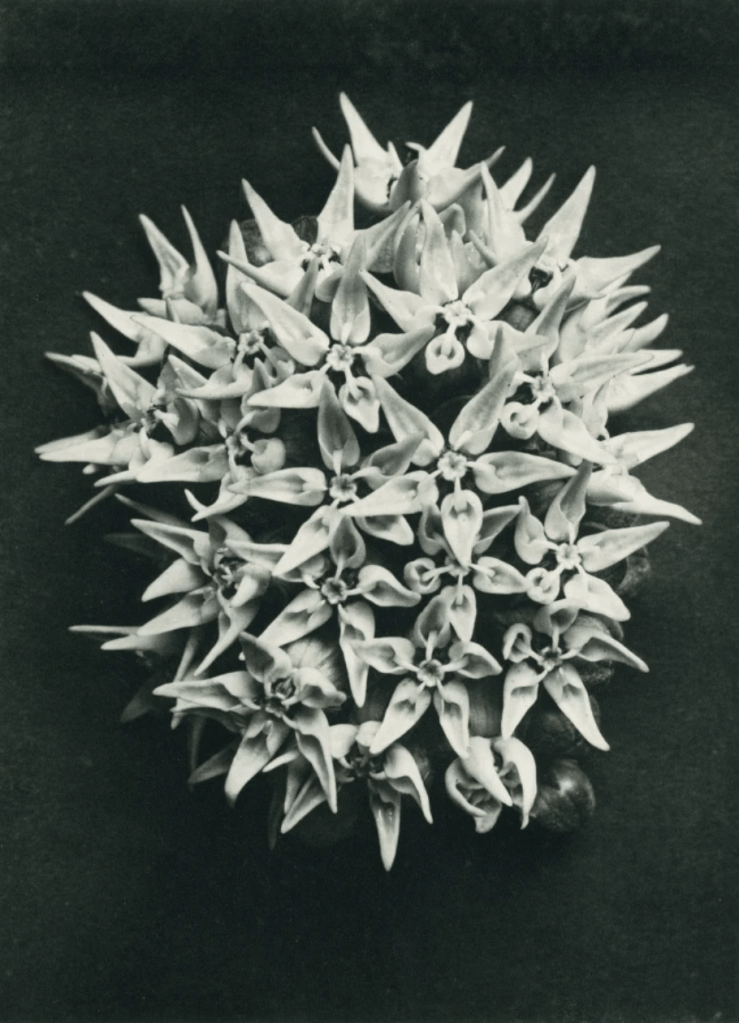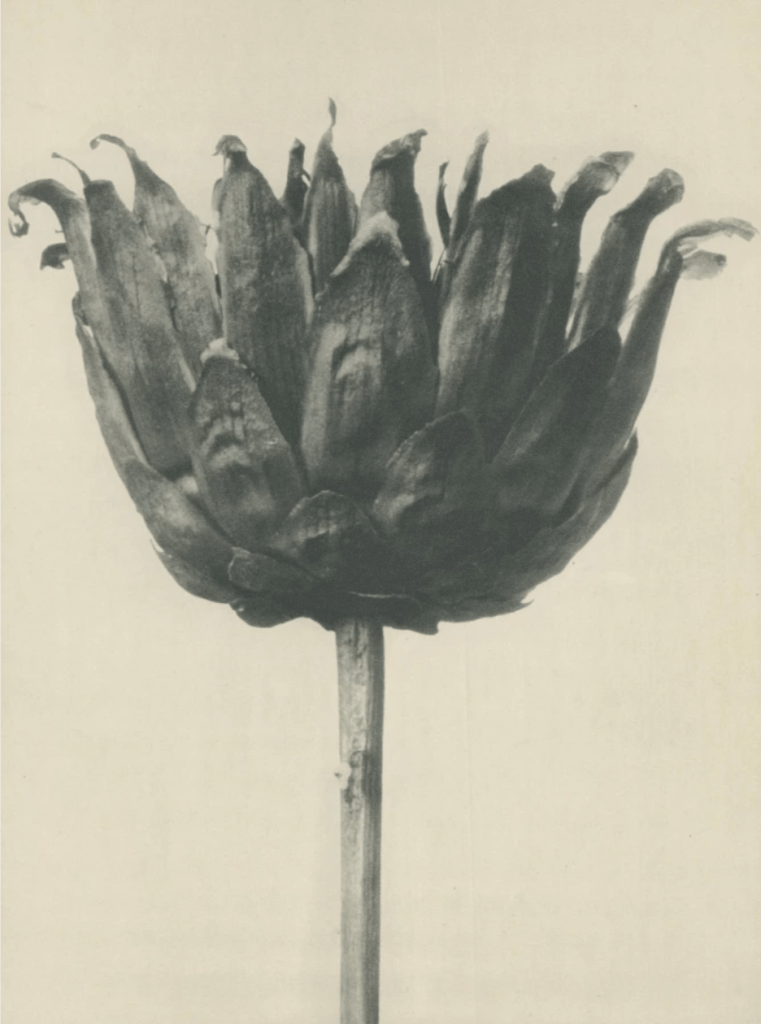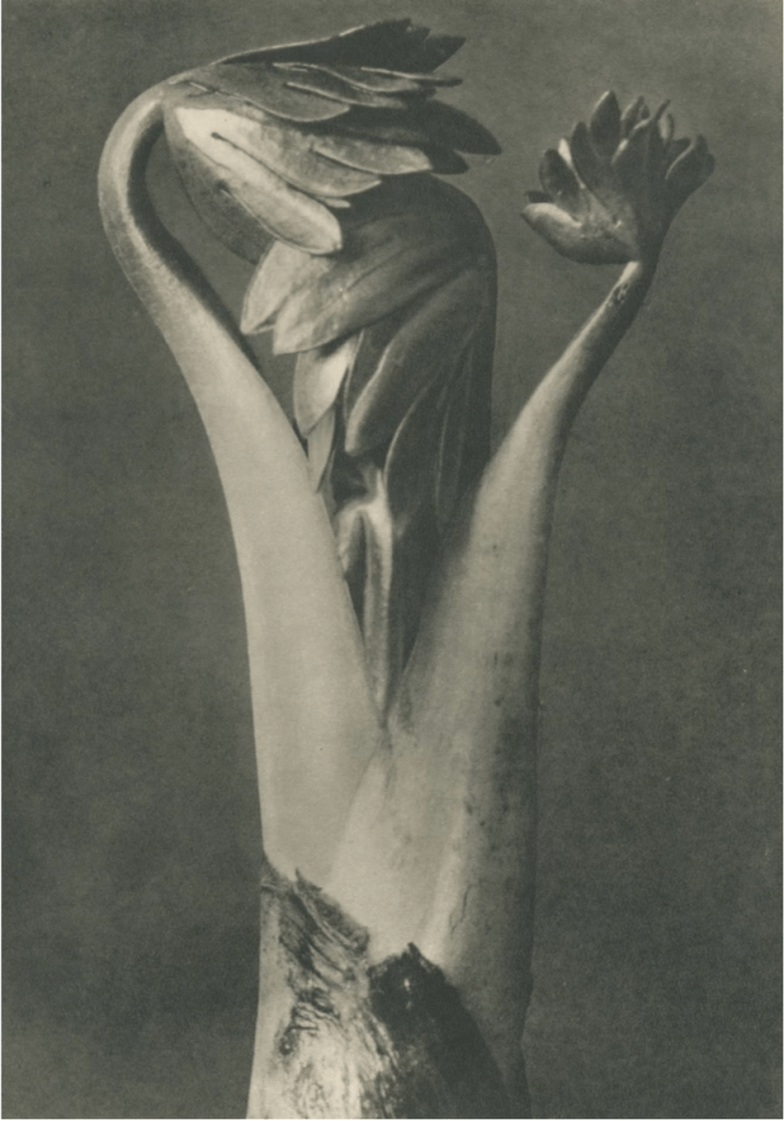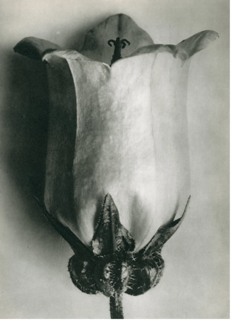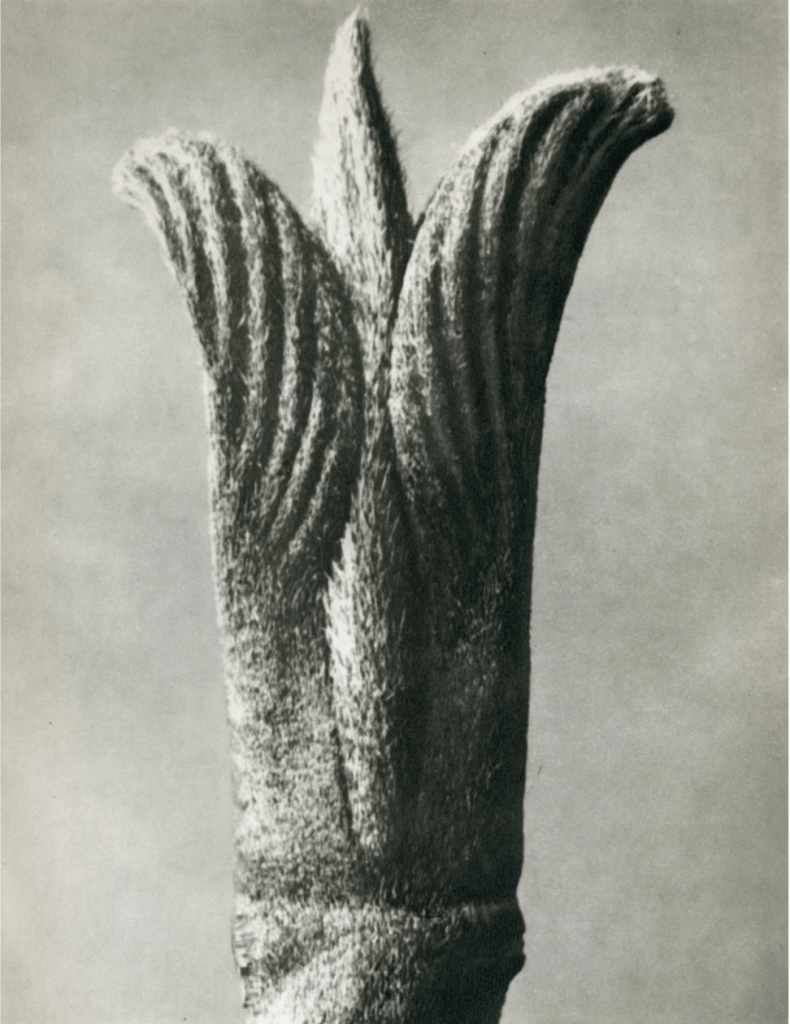 Working in the early 20th Century, Blossfeldt sought inspiration for his plant forms from the works of Fox-Talbot and Anna Atkins and their floral contact prints made in Calotype and Cyanotype forms respectively in the 1800’s. A lecturer of architecture, Blossfeldts original purpose for his photography macro studies of plants was to draw inspiration to use in the design of buildings. The resulting images have gone on to become admired as photographic works in their own right.