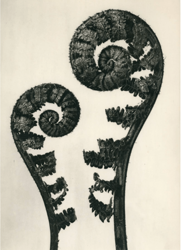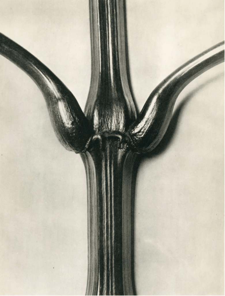 The Frame and The Vantage point come together in Blossfeldt’s work to create a complete lack of sense of scale. These forms have no reference point, as a result we as the viewer are unaware of how big or small they are. The frame often excludes the continuation of the specimen and focuses our viewers attention onto a particular segment of what is on show. As discussed briefly above, the vantage point focuses us on a level with the specimen and concentrates our attention.
