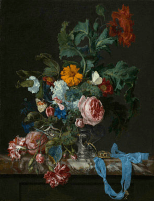 Beerts’ scene, above, displays cherries and strawberries and a dragonfly in the foreground. The fruit symbolises the souls of men while the dragonfly represents the devil waiting to corrupt them. The scene features darkness moving through the background with objects fading into this darkness.