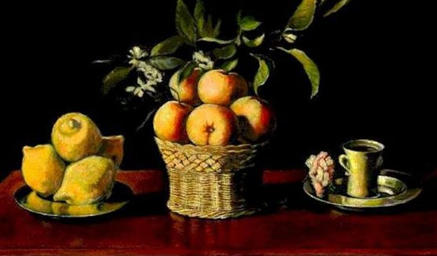 Caravaggios’ composition of a bowl of fruit is set against a light background. The scene is well lit and features apples. Apples being a common symbol of knowledge but also the forbidden fruit for which Adam and Eve are cast out of the garden of eden for consuming.