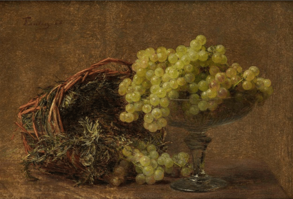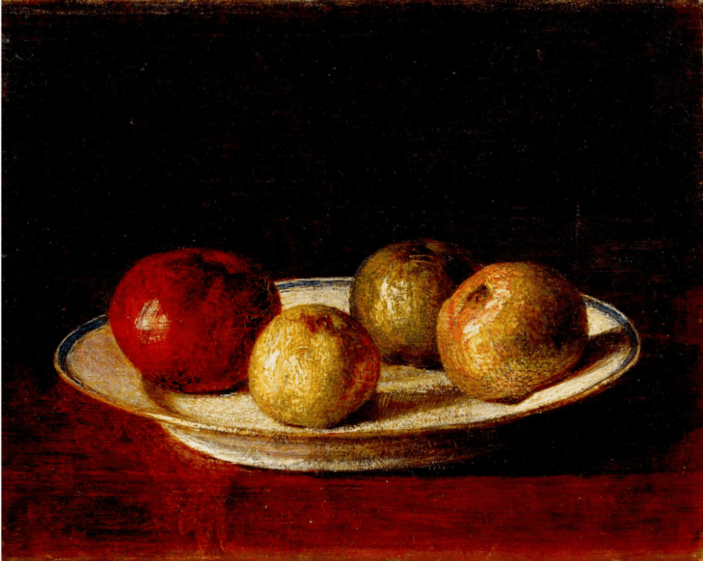 As outlined in a previous post many of the classical still life paintings had symbolism in the objects contained, the lighting and the often arrangement of those objects. Fantin-Latour’s studies of fruit arrangements varied in terms of lighting but all of them possess rich colours. The apples signify the forbidden fruit and the story of Adam and Eve and the expulsion from the garden of eden.