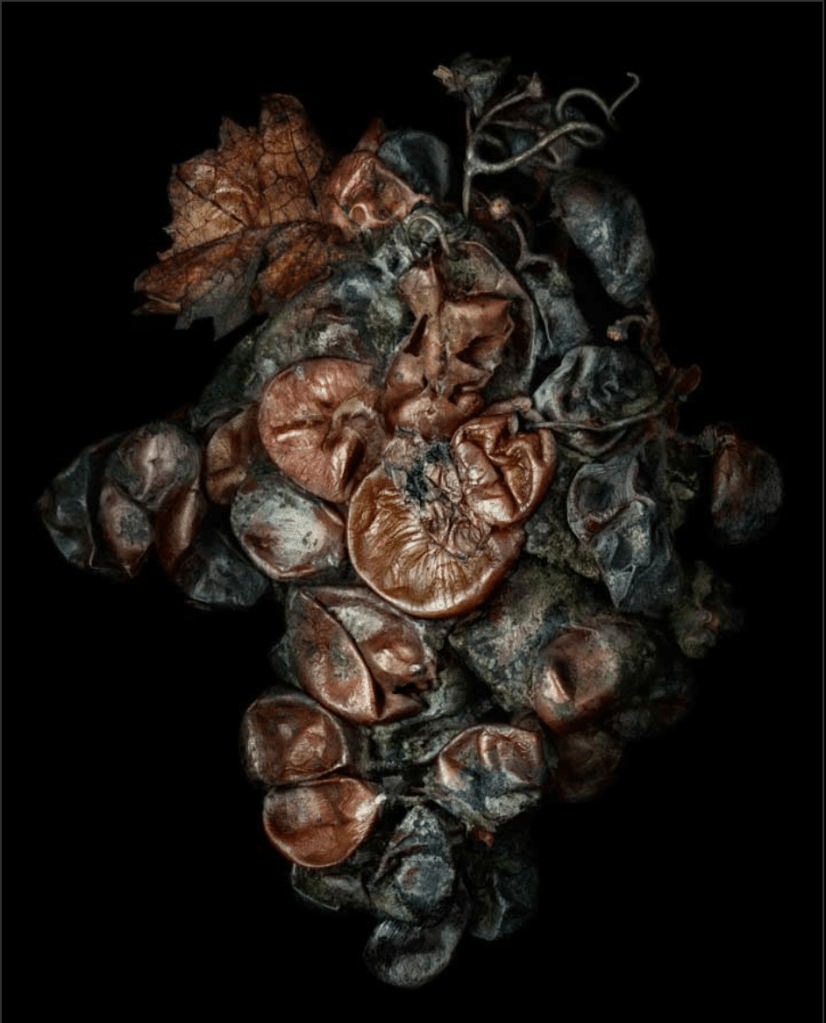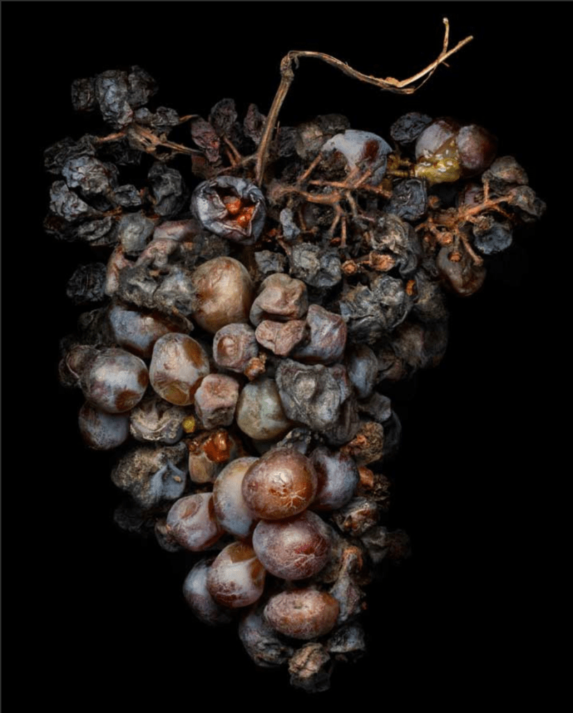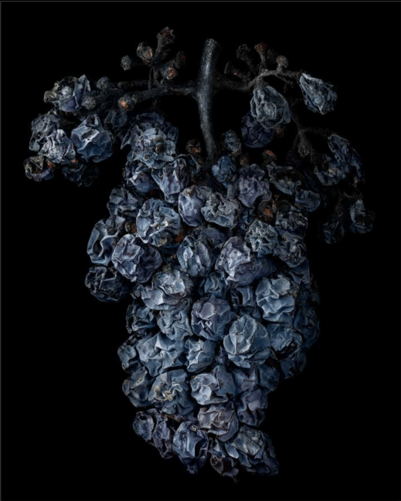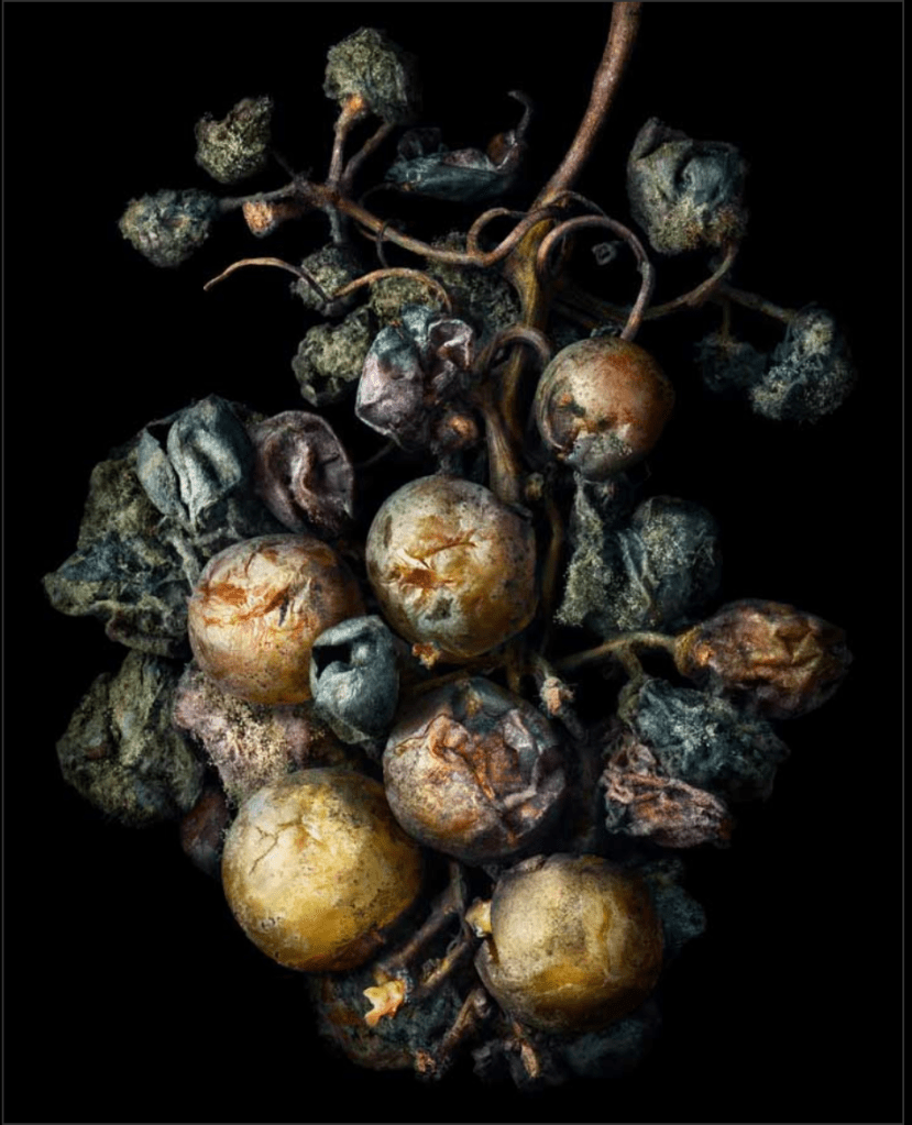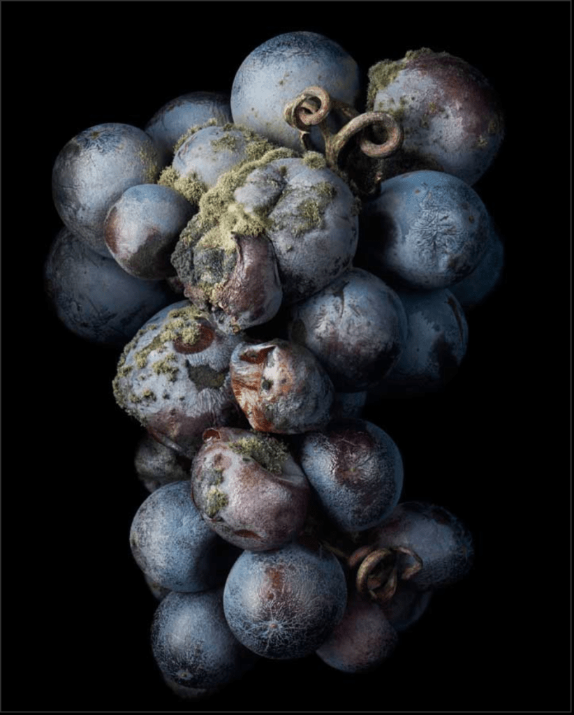 In Lippmann’s ‘Noble Rot’, his use of hard lighting and a black background create a chiaroscuro feel to the illumination of the subject matter. In still life iconography grapes are used to signify wealth and attainment. Historically they were tough to get hold of and expensive, hence their often appearance in mosaic floors, carvings and paintings. Here we see that symbolism pushed back in the other direction with the use of rotting grapes. In the title, the word ‘noble’ nods back to the historical symbolism found in grapes, while the ‘rot’ shows them exactly for what they are.