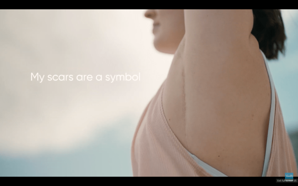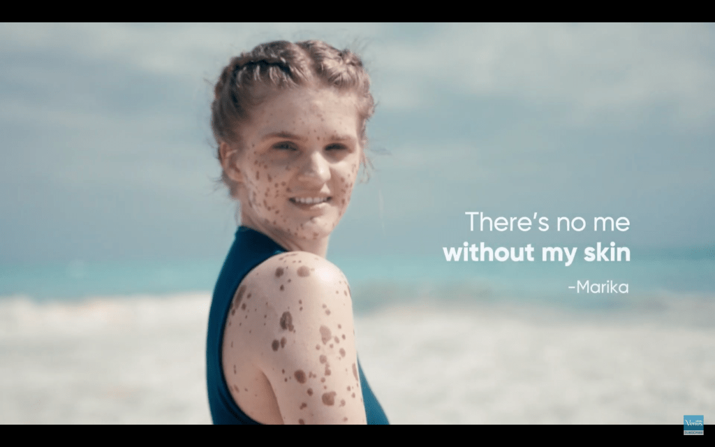 ‘My Skin. My Way Stories.’ takes anecdotes and quotes from supposed users of the products and posits them next to models which we come to assume are the originators of those quotes. The focus is on the ‘imperfections’ left behind by life and the womens experiences of life. This comes in the form of Caesarean section scars, stretch marks, other operation scars and skin conditions. These are focused in on closely so we are unable to escape what is being shown. The types of people being shown are broad, they are different ‘sizes’, different skin tones and ethnicities, they are a spectrum of society rather than a segment. One is a mother and so we see the maternal side to women, a kind of support which only a mother can give. There are no males featured in the advert and no reference to the need to ‘shave for men’. In one shot there is a group of women together in sisterhood, often referred to as Sororal.