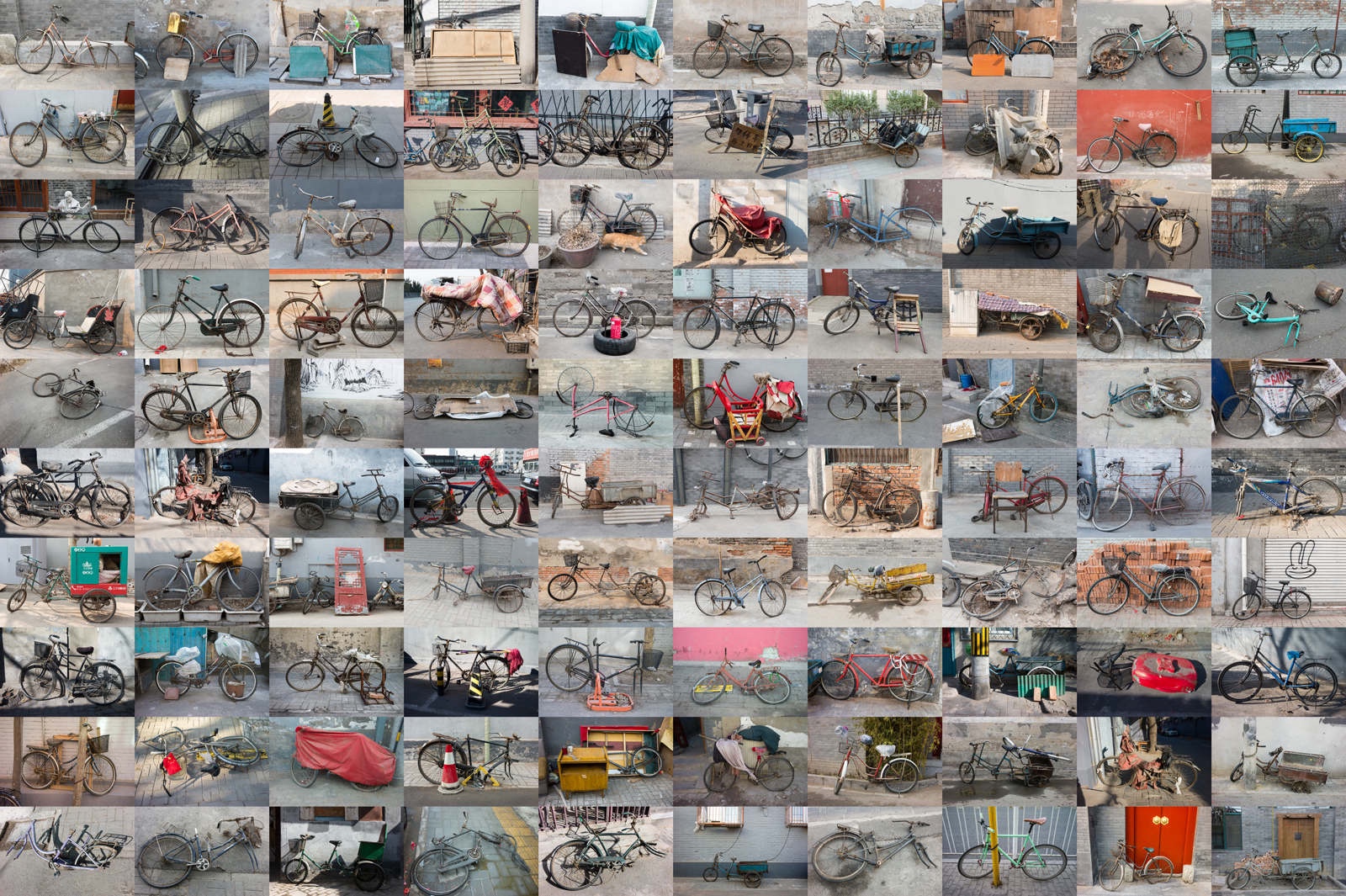 Zhao Xiaomeng. Available also as individual images, Bicycles in Beijing, Now, explores the left behind modes of transport which are the victims of the march of industrialisation in China. When displayed as below, the photographs become both unique and synonymous with each other simultaneously. The collection of these objects when together form an aesthetic which is both overwhelming and informative at the same time.