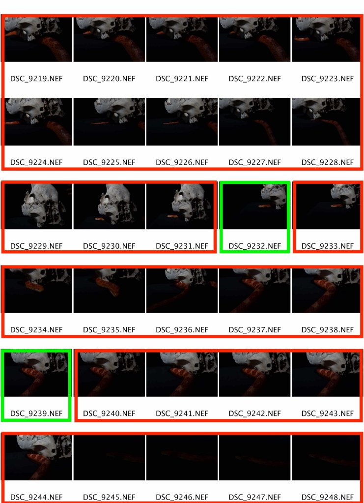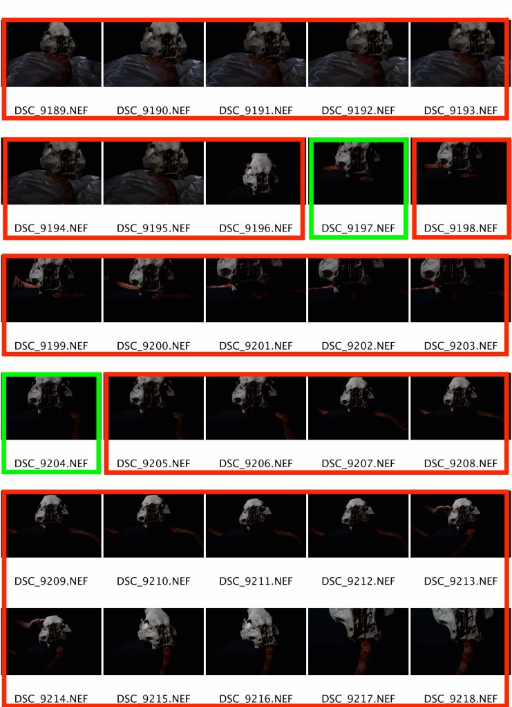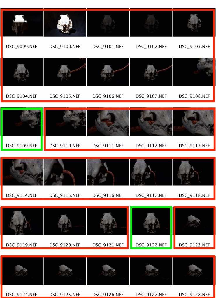 With just the skull and the snake I was set to shoot. To begin with I shot freehand moving onto a tripod for the last sequence of images shown below. Freehand was great as it enabled me to get a range of images but using a tripod last created better images by far. Using my preferred deadpan style, this sequence works well together and experimentations of these images with each-other in triptych form could be a next consideration.