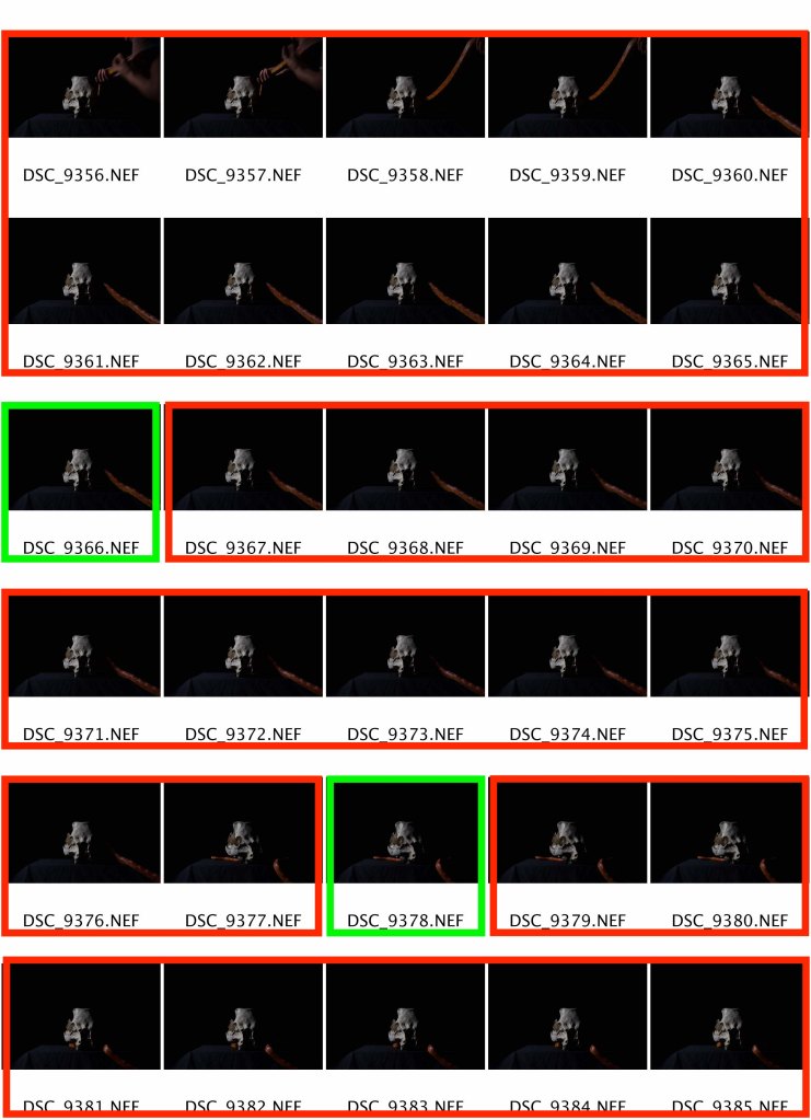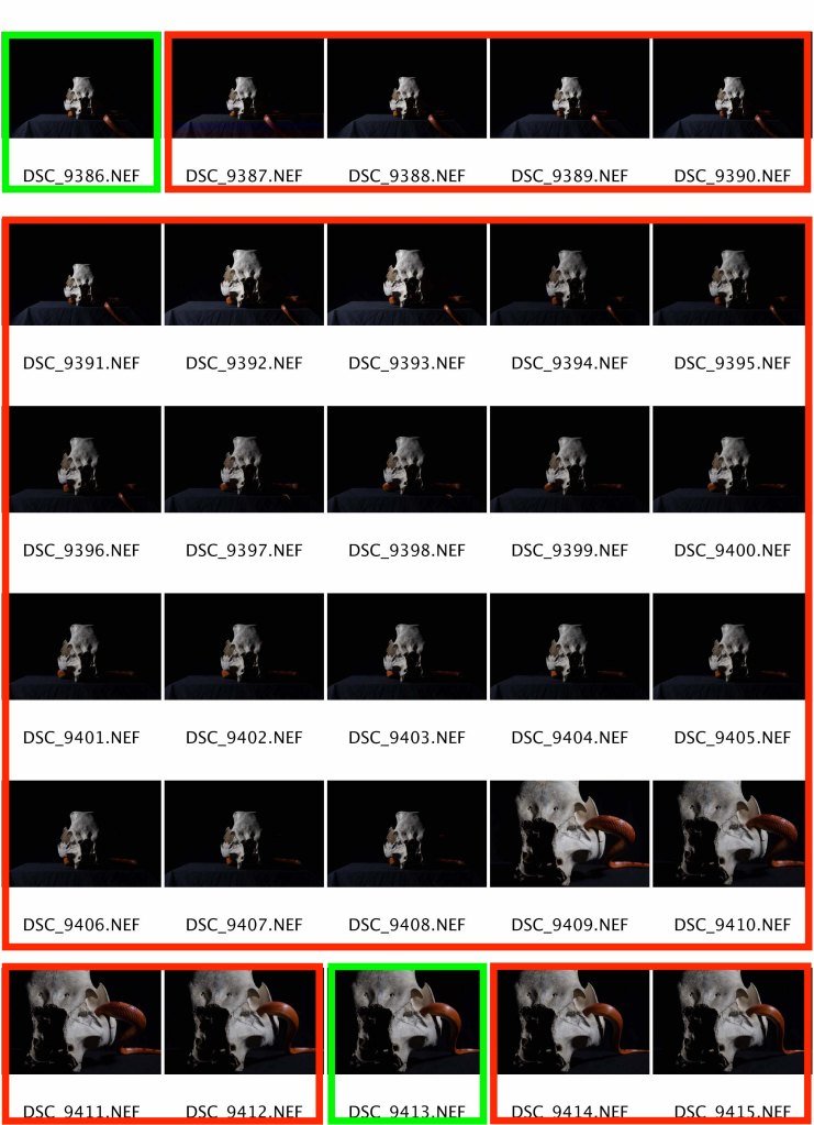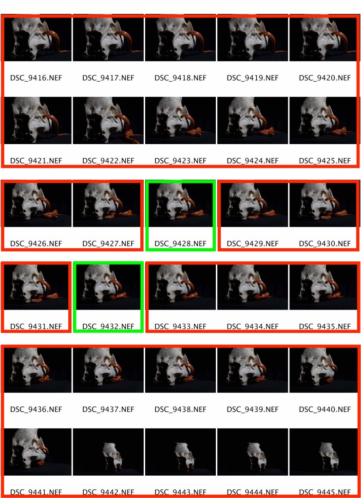 The image below in green are selected and have been worked with further while the images in red have been rejects. The selected images are visible here.