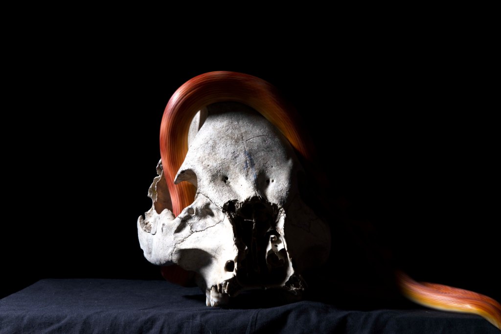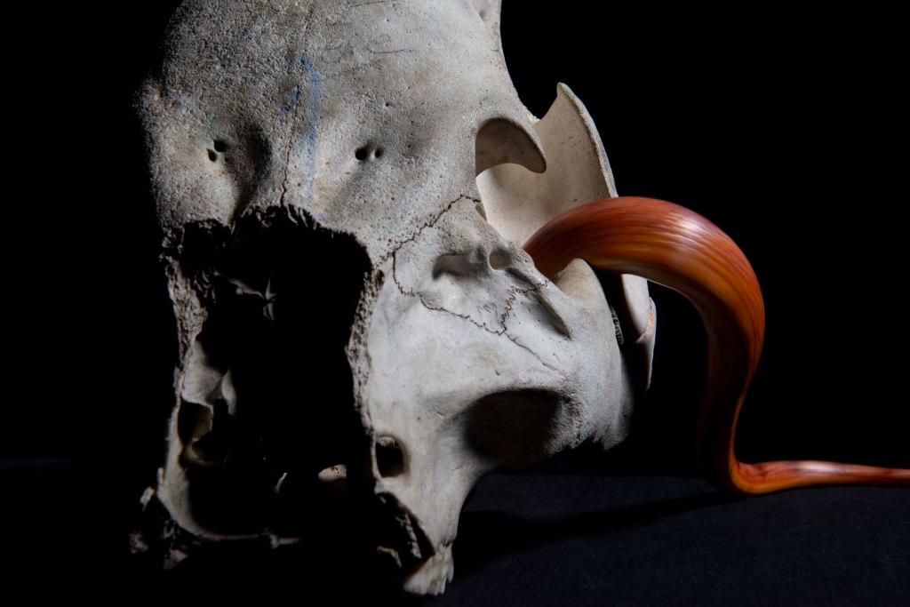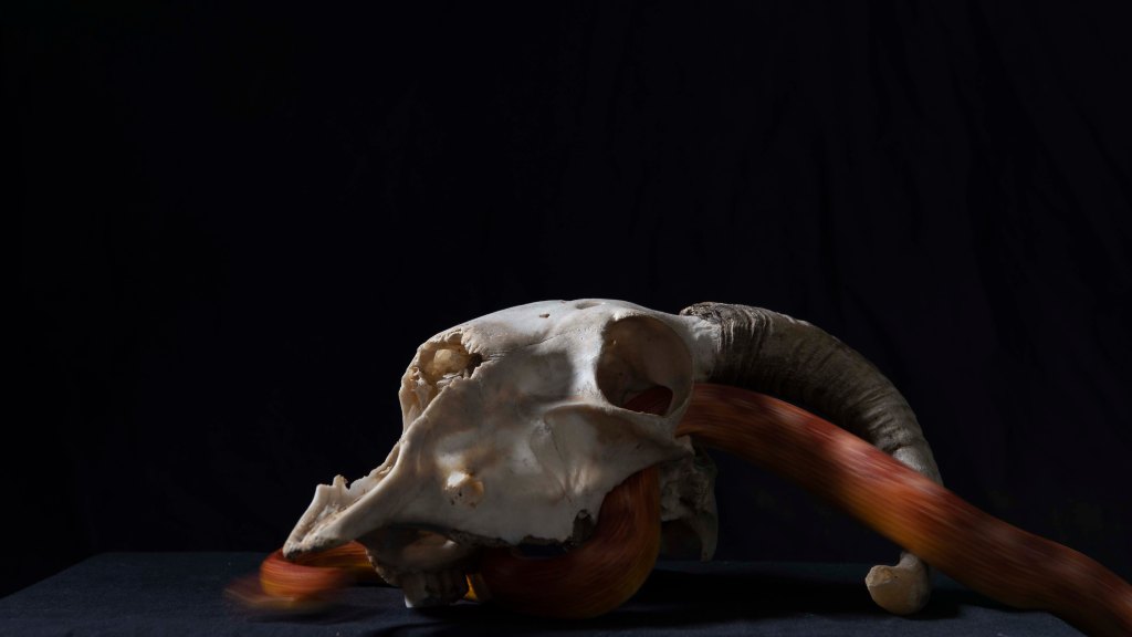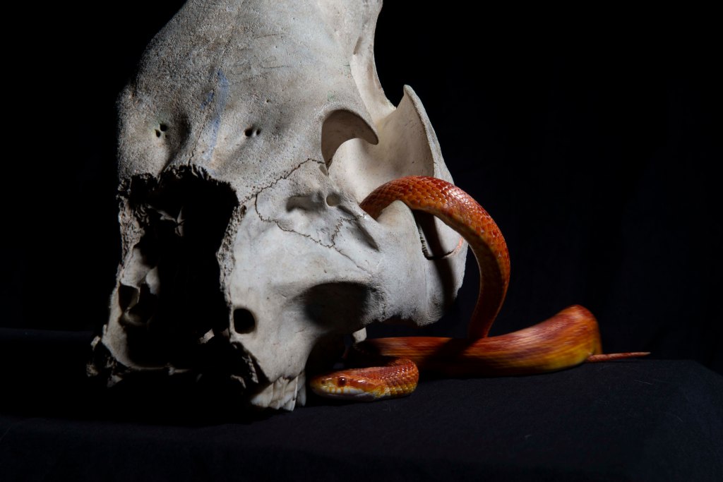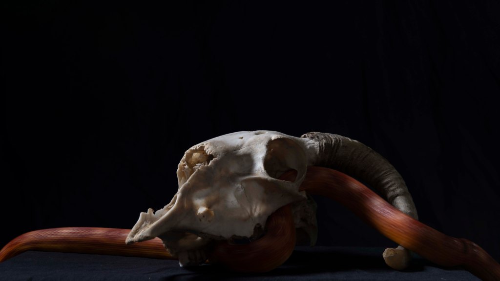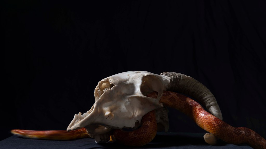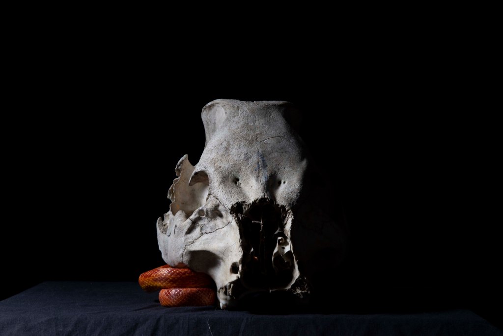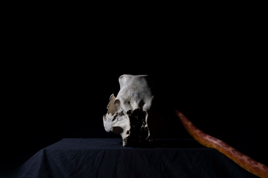 The movement blue is made effective by how still the skull is. We cannot see any typically identifying features of a snake but we are lead to believe it is such. These particular images have been very successful and I am very happy with them.