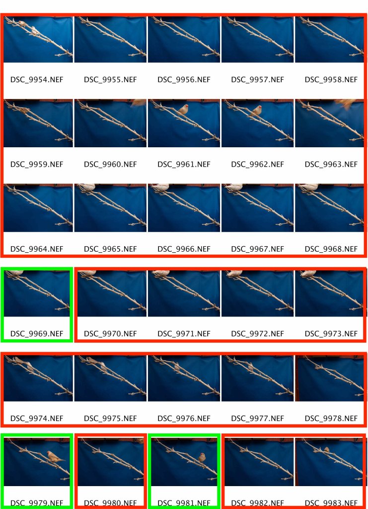 The next gallery show the images in contact sheet form. This shoot involved a lot of patience and waiting for the birds to be in the right place at the right time. They would often flinch when the camera fired so the first image each time would typically be the best one.