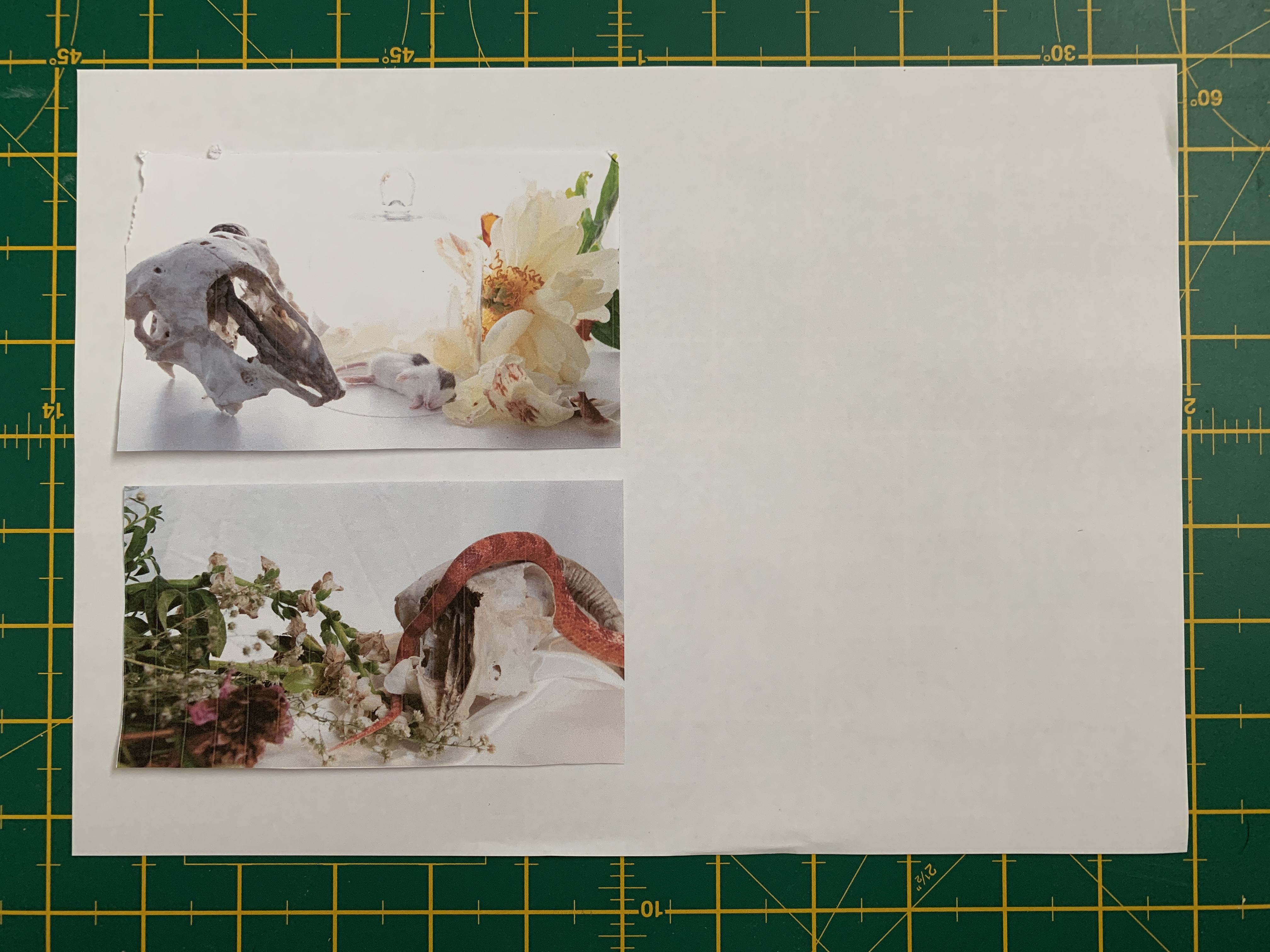 Where some images in the original selection were a bit repetitive I have decided to combine them. The groupings compliment each other and work together as images. Some consideration was put into where in the frame these images would feature and physical posturing of printed images was part of my process (below).