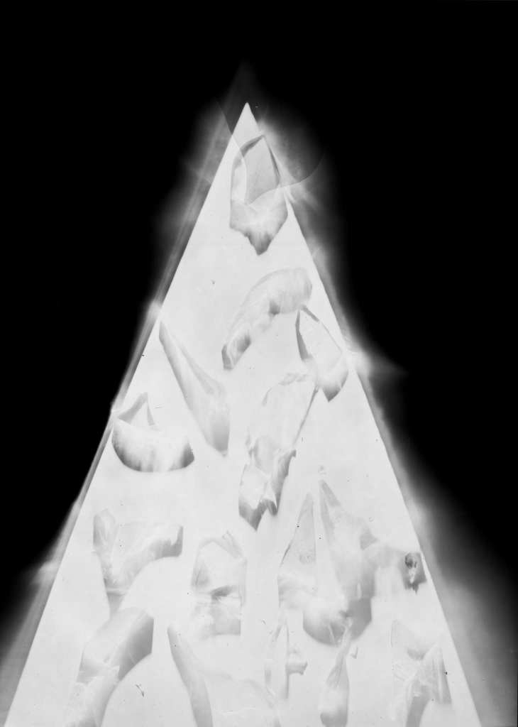 Further experimentations with broken glass and angling the light in different ways onto photographic paper. ’Scan 5’ is of particular interest to me with particular satisfaction gleaned from the fall off of light on the edges of the triangular mask. A series of selected and refined images can be found in the gallery below this contact sheet.