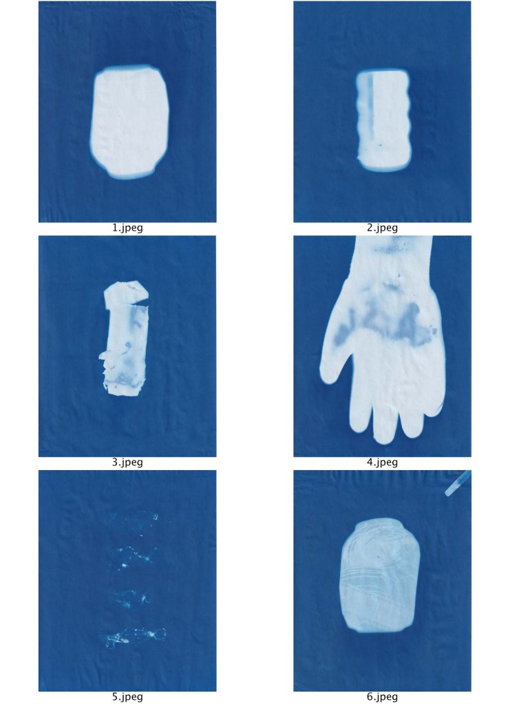 The items were then used to produce cyanotypes. The most successful were definitely those that are more transparent such as the sweet wrappers. These prints were then scanned and formed into another contact sheet for display below.