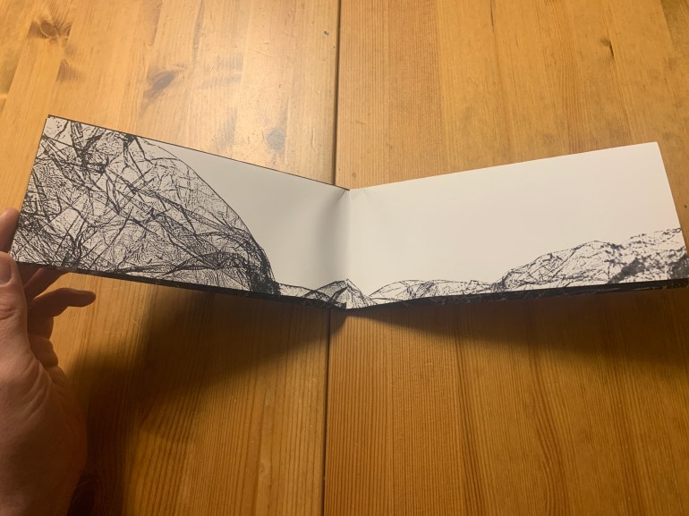 The next gallery below shows a range of photos of the book. As said previously I want to reprint this and place the ‘mountain’ the other way up. I’m also unsure about what to have as the type at this point in time, or even if type is necessary at all.